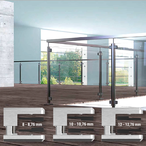 Mit Zinkdruckguss-Klemmbefestigungen die für Glasdicken von 8 - 12,76mm variabel einstellbar sind, sparen Sie Lagerkosten und Wartezeiten.
